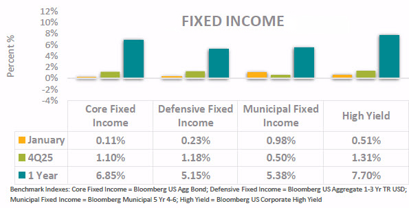 • Core fixed income posted modest gains in January, supported by stable rates and a constructive macro backdrop. The Bloomberg U.S. Aggregate Bond Index rose 0.11% for the month rebounding from its slight fall in December and is up 6.85% over the past year, benefiting from higher starting yields and steady income generation. For investors willing to assume additional credit risk, high yield bonds outperformed with a 0.51% gain in January and a 7.70% return over the past year.
