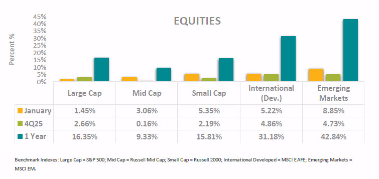 • International equities delivered strong returns during the month, supported by easing financial conditions and improving sentiment toward global growth. Developed international markets rose 5.22% in January, while emerging markets surged 8.85%, extending their strong performance from late 2025. Over the past year, emerging markets are up over 42%, and developed international stocks have gained over 31%, benefiting from attractive valuations, a weaker U.S. dollar backdrop, and renewed investor appetite for global diversification.